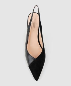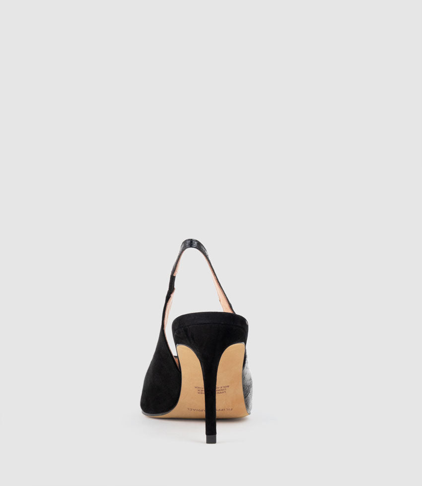 Introducing the AMITA85 by Filippo Raphael for Edward Meller,a modern take on the classic slingback. This elegant pump features a pointed toe and an 85 mm heel, striking the perfect balance between height and wearability. Crafted from smooth suede with exotic snakeskin accents, the luxurious textures add richness and intrigue. A cushioned insole and full leather lining provide all-day comfort.
