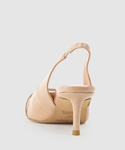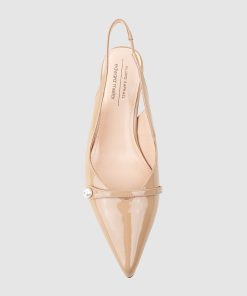 The DIVINE55 slingback pumps by Filippo Raphael for Edward Meller strike the perfect balance between elegance and sophistication. Crafted from glossy patent leather, they feature a pointed toe and a dainty strap embellished with a single faux pearl, adding a refined touch to the minimalist silhouette. Set on a slender kitten heel with cushioned leather insoles, they are the ideal choice for effortlessly polished day-to-night dressing.