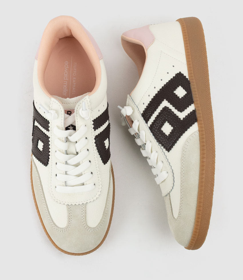 The JESTER sneaker by Filippo Raphael for Edward Meller blends sporty charm with refined craftsmanship. Crafted with a leather upper and fabric lining, it delivers a breathable and durable design. The removable leather-topped inner sole enhances comfort and versatility, making the JESTER an effortlessly stylish choice for everyday wear. Perfect for pairing with both casual and elevated looks.