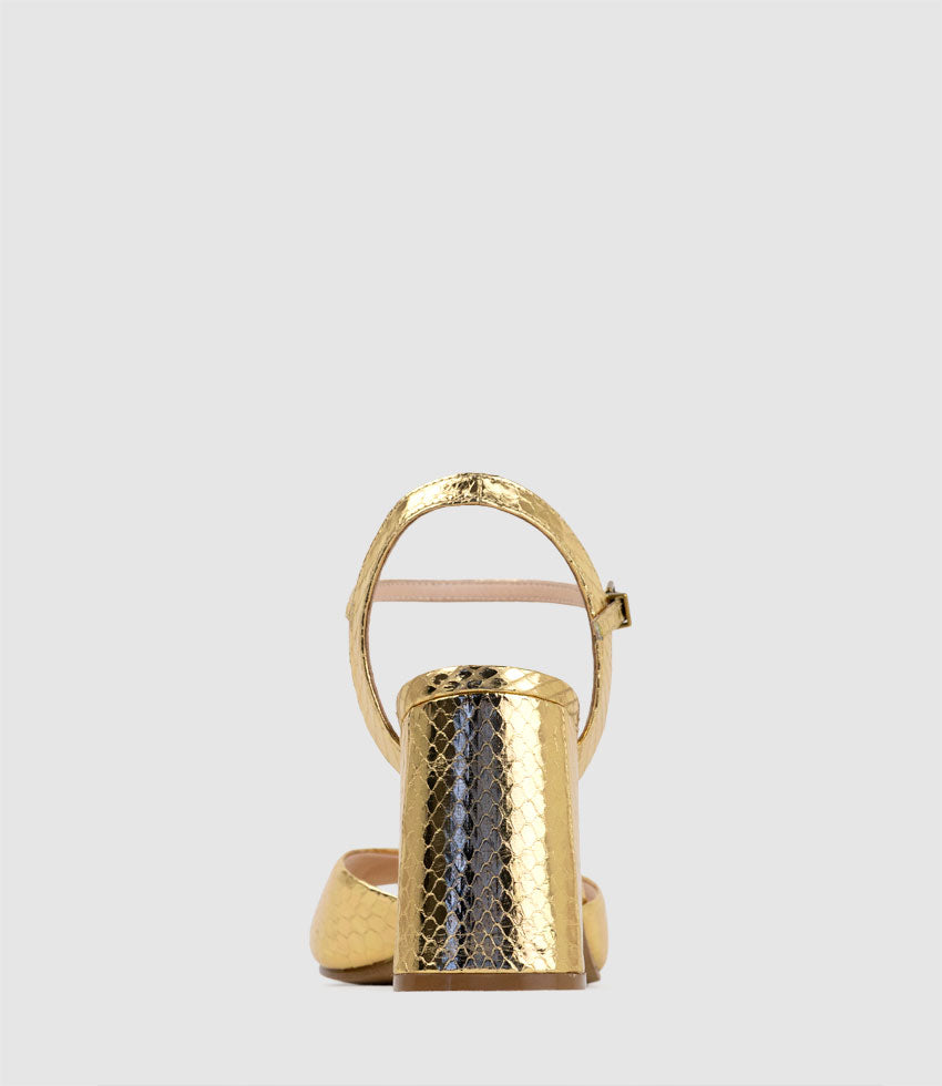 Introducing the KATO85 Sandal by Filippo Raphael for Edward Meller. These sandals are available in a range of versatile finishes, each topped with a chic horse-bit detail. They feature a classic round toe and an 85-mm block heel. The silhouette is simple and chic, perfect for any event.