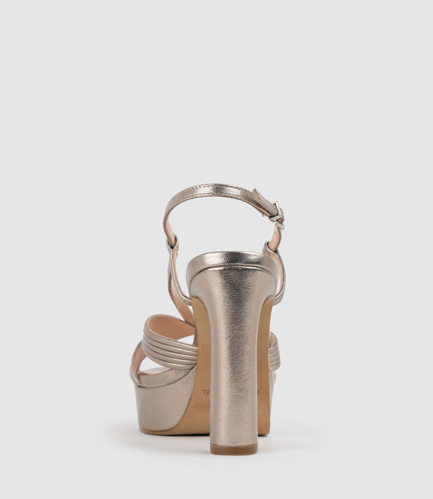 The SYRO110 platform sandal, part of the Platinum Collection by Filippo Raphael for Edward Meller, is a striking combination of elegance and stability. Designed with a chic block heel of 110 mm and a sturdy platform, this style offers both height and comfort. Featuring intricately detailed straps and a secure buckle-fastening, the SYRO110 is perfect for evening events or elevating your party wardrobe with effortless sophistication.